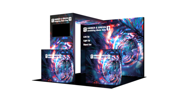 Perfect for product demos or multimedia content, the front lightbox supports a 32” mounted TV giving you the flexibility to showcase video or digital messaging. A sleek backlit counter completes the setup, offering both branding space and functional interaction for your booth staff.