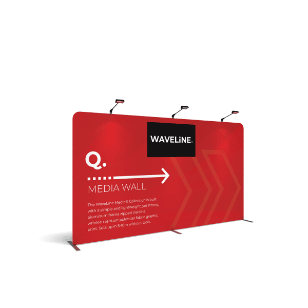 This 4mW x 2.3mH WaveLine Tension-Fabric Backdrop is built with a simple and lightweight, yet strong, aluminum frame with a pillow case-style, wrinkle-resistant polyester fabric graphic panel which zips over the frame to create tension and remove creases.